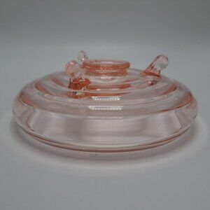 This vintage pink depression glass dish from the 1930s is ideal for holding candy, nuts, or trinkets. Its ribbed Manhattan pattern adds elegance.