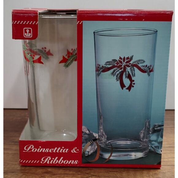 Anchor Hocking Poinsetta & Ribbons Iced Tea Drinking Glasses Set of 4