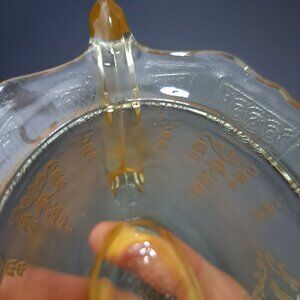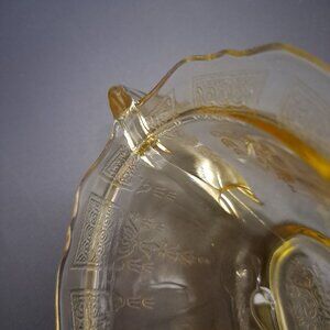 This vintage glass bowl showcases a beautiful embossed design, adding a touch of elegance to your table setting. Its vibrant yellow color is visually striking.
