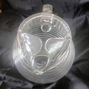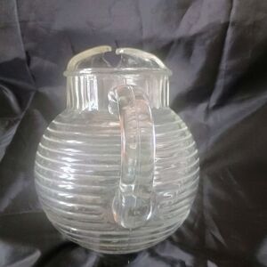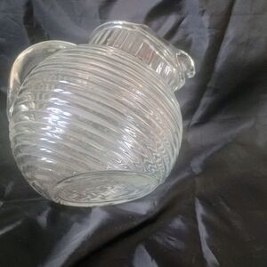 Anchor Hocking ribbed glass pitcher - the "Manhattan". Holds 1 quart and is designed to sit in a tilted position.