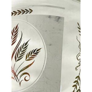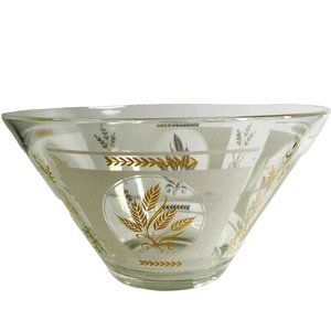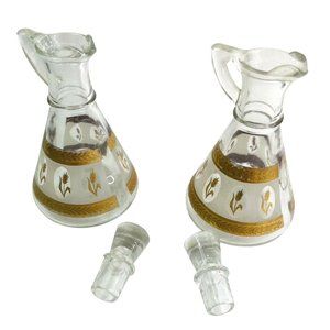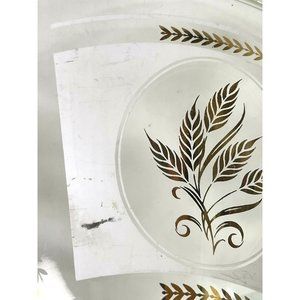 These pieces were purchased as a set but after further inspection, I believe they are similar design from different manufacturers, I will consider separating. The salt & pepper shakers have the Anchor Hocking mark, The cruets set has the Brockway Mark and the Bowl is unmarked but matches images of the Hazel Atlas Gold Frosted Wheat design. They all have frosted glass with gold wheat print. There are some discoloration/scuffs on the finish, particularly on the bowl. Please see my photos for detail.