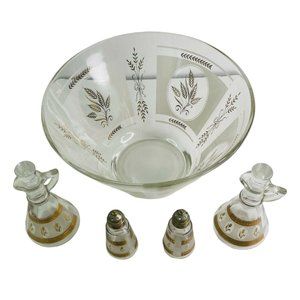 Anchor Hocking Salt & Pepper, Hazel Atlas Bowl, Brockway Cruet Set Gold Wheat