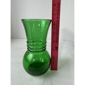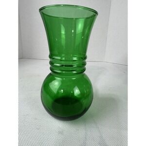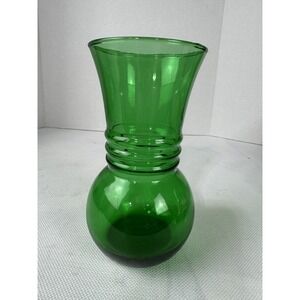 The Anchor Hocking Vintage Ribbed Green Wide Mouth Base vase is a small round vase measuring 6.5 inches tall and 3.5 inches wide. The vase features a ribbed pattern and is made of green glass, making it a charming decorative piece for all occasions. The wide mouth design allows for easy arrangement of flowers or other decorative items. Perfect for collectors or those looking to add a touch of vintage charm to their decor, this vase combines both style and functionality in a classic design.