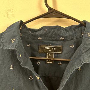 Navy shortsleeve button-up shirt. Size L but runs on the smaller side. Shirt is not grey despite that one picture washing out the color.
