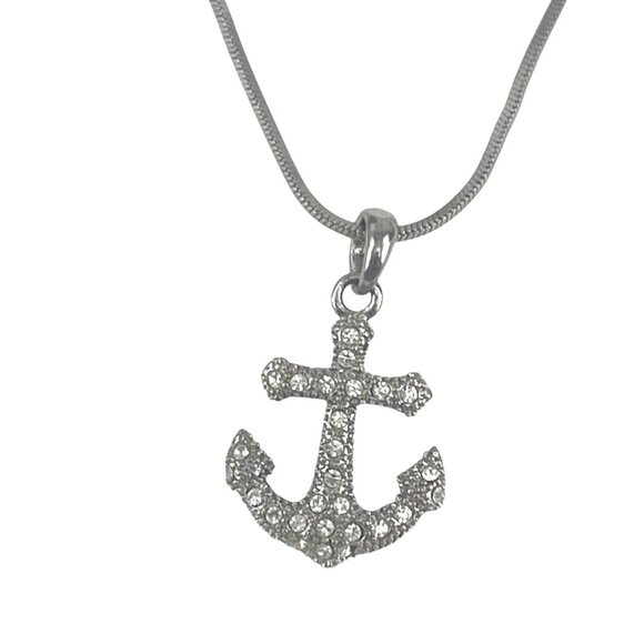 Anchor Pendant Necklace With Rhinestones On Silver-Tone Chain
