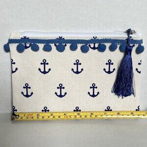 Anchor Pouch PomPom Canvas Navy Blue Nautical Print Zippered Storage Travel Bag