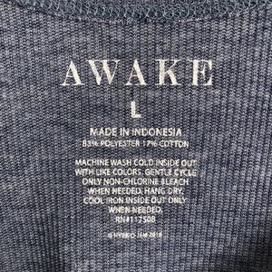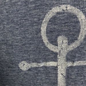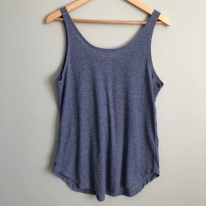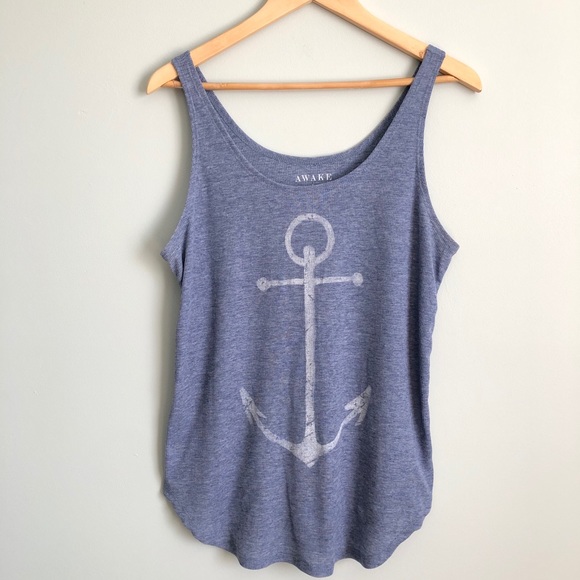 Denim colored, ribbed tank top with scoop hem and distressed anchor graphic.