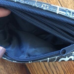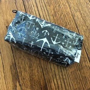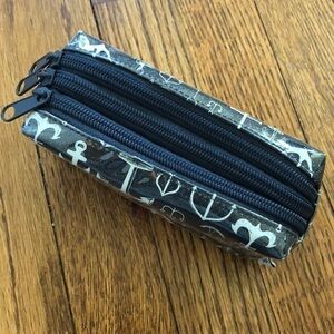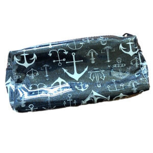 Small makeup bag with anchors on it.outer protective lining with a blue sparkle interior lining. 3 compartments with zippers! Purchased from icing.
