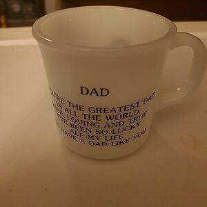 Pre-owned in good condition. Vintage milk glass mug that says Dad on one side and Dad You're the greatest Dad in all the world wise,loving,and true. I have been so lucky all my life to have a Dad like you. Oven proof and made in the U.S.A.