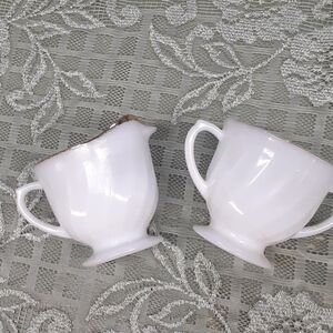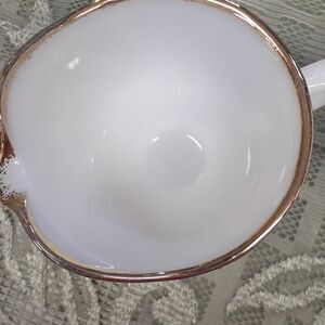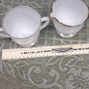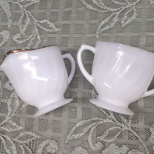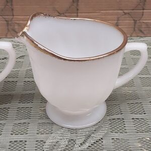 Vintage Anchor Hocking Fire King Cream And Sugar Bowl Milk Glass Swirl Gold Trim. In nice shape. Sugar bowl has more of the gold trim worn away. Preowned. No chips or cracks. Made in USA.