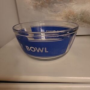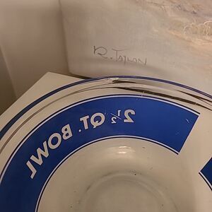 Pre-owned in vintage condition. Two and a half quart bowl.Has signs of wear and one small chip that is pictured which is on the inside lip of the bowl.Microwave safe .Not for stovepipe or broiler use.