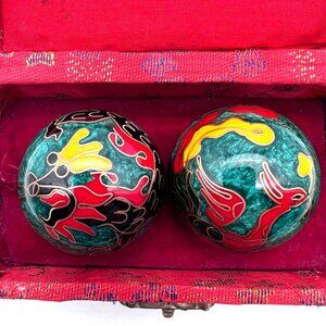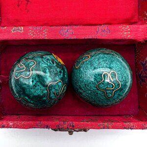Enhance your relaxation routine with these Chinese Baoding Balls. Encased in an ornate red silk box, they offer both aesthetic appeal and functional use with the relaxing chime emanating from within.