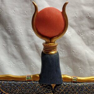 Isis, The Great Mother in ancient Egyptian mythology: Isis was a goddess with many roles and functions, including: Love, Healing, Fertility, Magic, Moon, Life, Women and children, Sailors and travelers, Egyptian kings, and Mourner. The statue has Isis in a classic pose. The wings of Isis represent power and mourning, resurrection and protection. This is reinforced by the green color of the wings because green symbolizes both life and resurrection in Egyptian art. The wings also symbolize safety because they are depicted as outspread, which is a protective gesture in Egyptian art. In this way, the wings of Isis reveal her magical ability or resurrection powers, her grief, and her protection of the dead.
