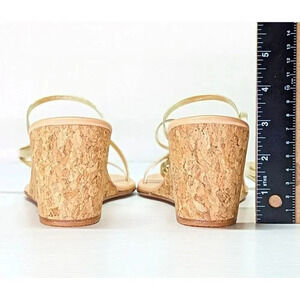 The Lithi sandals from Ancient Greek Sandals are crafted of metallic leather in a strappy silhouette. This pair sits atop a cork wedge heel.