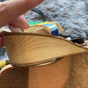 A collaboration between Ancient Greek Sandals and designer Peter Pilotto. A bold pattern and polished hardware give an edgy feel to these wedge sandals. Buckle closures. Stacked wedge heel. Crepe patch at leather sole. Leather: Cowhide. Made in Greece. This item cannot be gift-boxed. Heel: 1.75in / 45mm