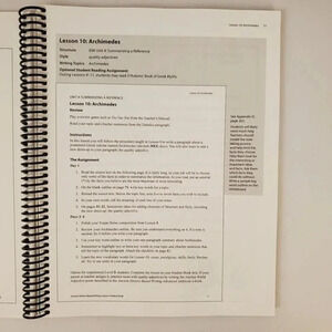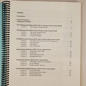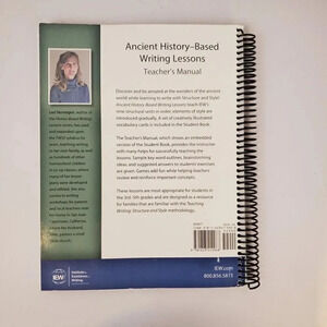 The Ancient History-Based Writing Lessons Teacher Manual includes reduced copies of all student pages. Accompanying teacher notes include specific insight into structures/styles being taught, vocabulary instruction, games, review, motivation ideas, and checklists. Suggested responses for many student activities are given (not the same as an answer key) but answers are provided for vocabulary quizzes. Information on how to access to course pdf downloads is also provided. These downloads include reproducible checklists and optional material.