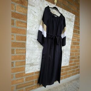 Ancient Kallos navy Linen Kaftan Dress - 100% Handmade in Greece, Boho Maxi with Belt . Elegant Ancient Kallos kaftan dress, handcrafted in Greece from 100% premium linen. Features a relaxed maxi silhouette, gold and white sleeve accents, tie belt, and off-shoulder neckline. Measurements: armpit to armpit 22", waist 22", length 56". Perfect for resort wear, beachside evenings, or bohemian-chic styling. Keywords boho chic slouchy boxy on trend work office women men kid hipster stylish fall autumn winter spring summer vintage retro 80s 90s y2k vacation chunky cozy goth classic minimalist staple layer street wear hip trendy demure tags: neutral, distressed, chunky, knit, Langenlook, relaxed, monochrome, earthy, earth tones, warm, timeless, winter, trendy, classic, ribbed trim, cozy, cute