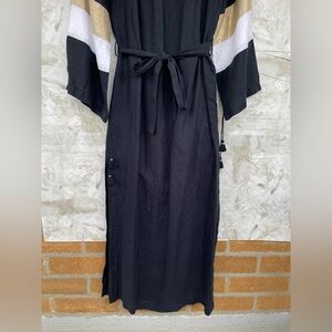 Elegant Ancient Kallos kaftan dress, handcrafted in Greece from 100% premium linen. Features a relaxed maxi silhouette, gold and white sleeve accents, tie belt, and off-shoulder neckline. Measurements: armpit to armpit 22", waist 22", length 56". Perfect for resort wear, beachside evenings, or bohemian-chic styling.