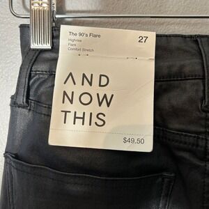 Keywords: flare leg jeans, high rise jeans, coated jeans, black jeans, size 27, women's jeans, retro jeans, stylish jeans, and now this, new with tags, flared jeans, party jeans, night out, dressy jeans