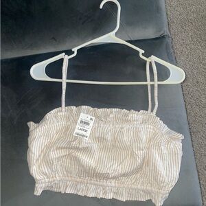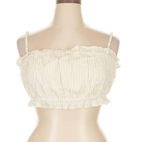 Chic crop top with ruffle details and thin straps. Features a stylish striped pattern. New with tags