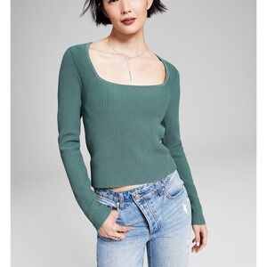 And Now This Ribbed Knit Top Square Neck Long Sleeve Green Casual Size L NWT