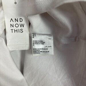 This AND NOW THIS white ponte tank top in medium offers a versatile and comfortable fit with its rayon and nylon blend. Designed with a classic crew neck and sleeveless style, it is suitable for casual outings or layering. Its simplicity and quality make it a reliable addition to any wardrobe.