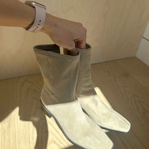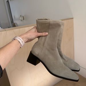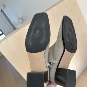 never worn! i bought two colors and missed the return window. still have stickers on them! a nice bone suede! super comfy!