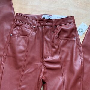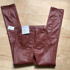 These beautiful And Now This 90’s inspired faux leather pants are a deep reddish rust brown color. Give pockets. Deep split on the front of each leg. Straight leg. Zipper front. Waist flat across is 12”. Inseam is 31”.