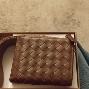 Elegant brown woven leather wallet with a secure strap. Perfect for everyday use.