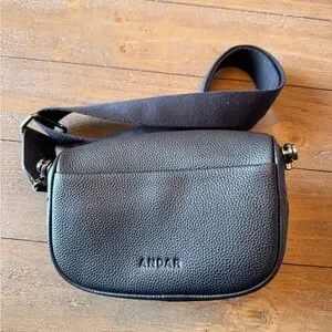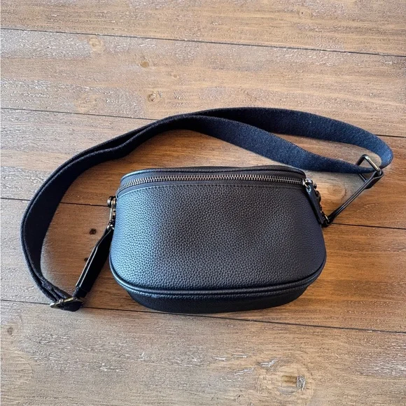 Leather mini Waymaker, Black Togo, great condition. Black canvas strap, 29 inches to 50 inches extended. Bag is 3x5.5x8.