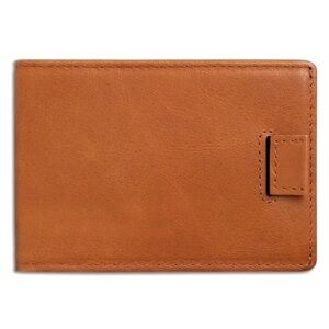 Features include:4 card slots (with front quick access slot); Holds 1–10 cards; Pocket with elastic pull-tab (quick & easy access to your cards); Cash strap; Natural Full Grain Leather; RFID protected. Measures 4 1/8" L x 2 15/16" W x 3/8" H.