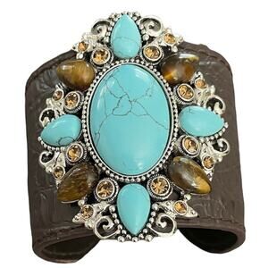 Andara Medallion Leather Cuff Bracelet Asian Turquoise and Tiger Eye MSRP $150