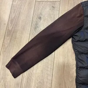 Black body with gradient brown/black sleeves. In excellent condition, except for minor mark on front near zipper and right front pocket zipper won’t stay closed (last 2 pics).