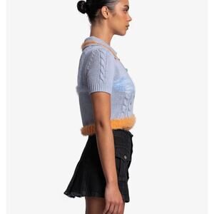 Andersson Bell women's cropped lingerie knit top in light blue and orange. This paneled polo top features a fuzzy bra applique at the chest and fuzzy trim along the collar and hem.