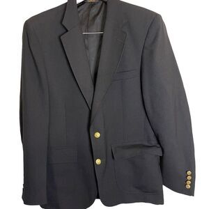 Men's black blazer jacket with gold buttons. This blazer has functional pockets on the outside and the inside. The materials and the size tag have been removed, so please refer to measurements. Also, the button where the collar is supposed to button down is missing.