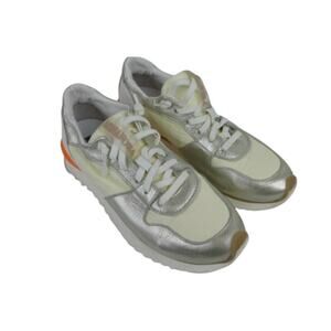 Platino. Muted leather, mixed with a citrus pop and metallic accents make this luxuriously soft. Made in Italy. Add a bold and modern edge to your wardrobe with these eye-catching sneakers from Andia Fora. Designed with a mix of metallic silver, white, and vibrant orange accents, these sneakers offer a perfect balance of luxury and sporty style.