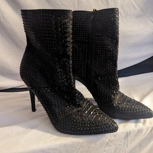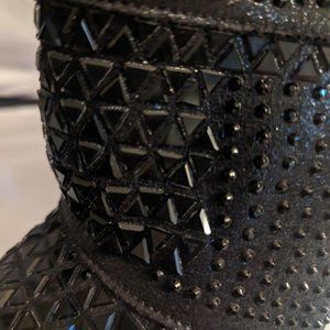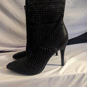 These boots are sparkly and beautiful black with stiletto heels. 4-inch heel never worn. Has zipper on the side .Excellent condition size 8.5 non-smoker and clean.