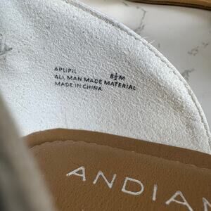 The Andiamo Sandals in white and sea foam green are designed for women in size 8.5M. These slip-on flats feature a stylish snake pattern and strap detail, offering a trendy and comfortable choice for casual warm-weather wear.