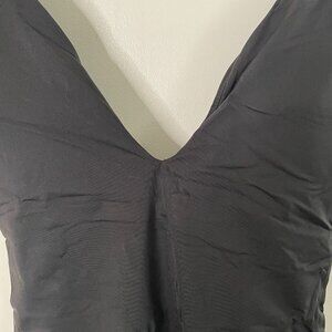 Elegant black one-piece swimsuit. Features deep V-neck and crisscross back ties. Perfect for a sleek beach look.