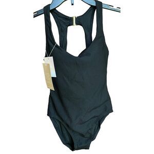 Andie One Piece Catalina Swimsuit Women XS Black Ribbed Oval Cut Out Stretch NEW