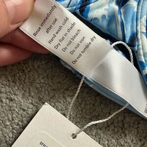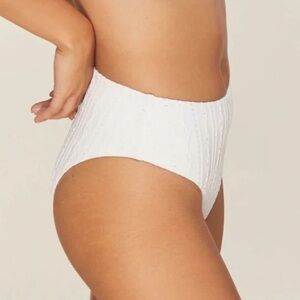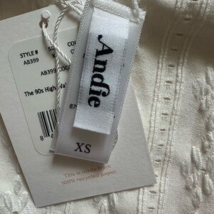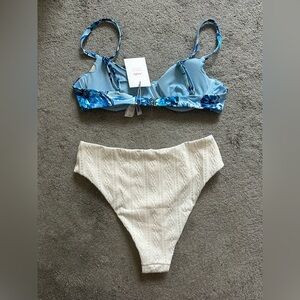 NWT. Andie swim Bermuda top in blue floral. 90’s high waisted bottom in coco white a cream color. Bottoms are textured. Pit to pit on the top is 14” and the waist across the bottoms is 12”. Both are XS.