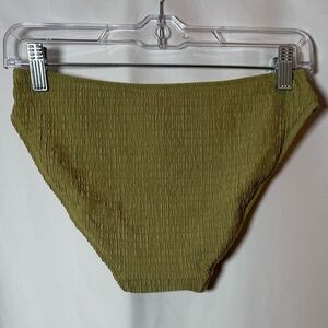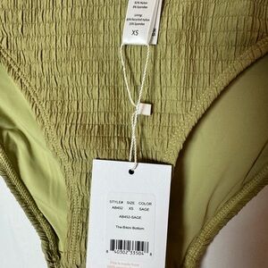 This Andie Swim The Bikini Bottom is brand new with the original tags attached. It has a smocked or rib like texture and is a size XS. It is sage green. It features smocked texture, medium leg cut, and medium bottom coverage.