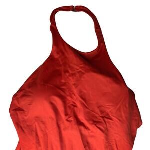 Brightly colored swimwear with a halter neckline and full bottom coverage. Removable cups and hook closure at the back of the neck.