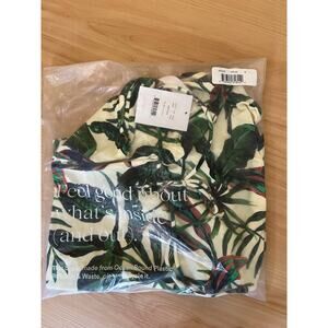 The Andie Waikiki swim cover is a multicolor cover-up designed for women, featuring a tropical palm leaf pattern. Made from eco-friendly recycled nylon and spandex, it is lightweight and breathable, perfect for beach or tropical vacations. The coverup can be worn as a halter or bandeau and can be ruched at the bust. This regular size S cover-up requires hand washing. It is new with tags.