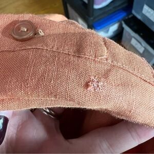 This one never made it to production! Exclusive style and color way. Auburn. Linen. One very minor imperfection on the cuff as shown.