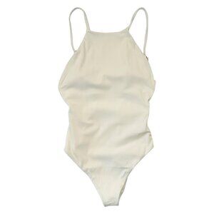 Elegant white one-piece swimsuit. Halter neck design. Perfect for beach or pool.