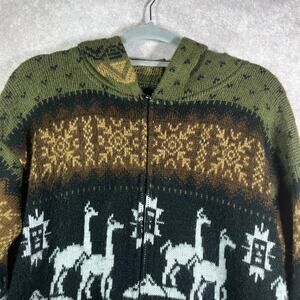 Andino Artesanias Cardigan Sweater Mens Medium Green Black Llama Wool Full Zip Hoodie Aztec Southwestern