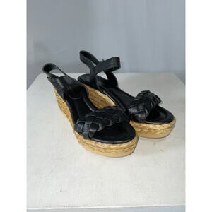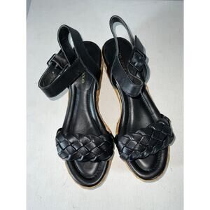 André Assous 'Cecilia' Black Leather Wedge Platform Sandal Size 9 US / EU 39: memory foam footbed for added comfort, open toe, buckled ankle strap, woven upper, leather upper and lining, synthetic sole.
