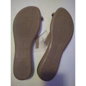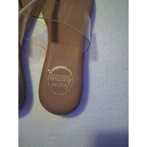 Lightweight André Assous sandals with clear PVC strap and brown leather toe loop. Made in Spain, featherweight comfort design. Minimalist, versatile look perfect for summer, vacation, or casual wear.