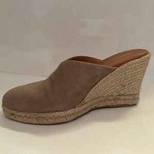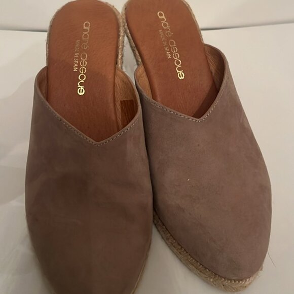 Tan suede Andre Assous closed toe versatile slip on wedge with rope detail on wedge.
